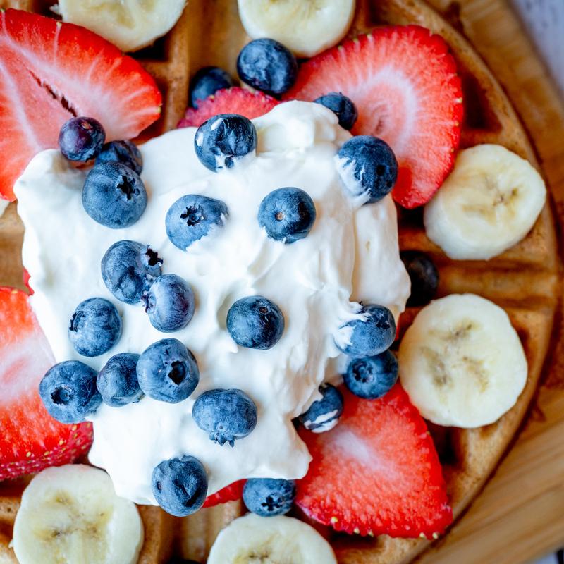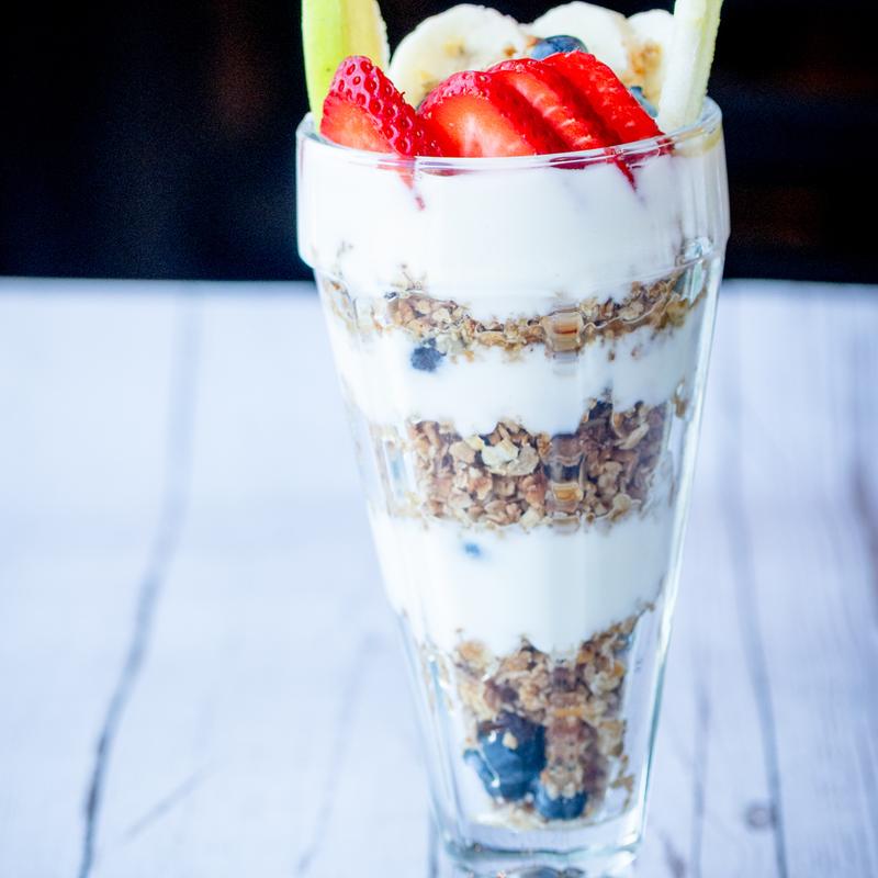 Granola, fresh fruit and low-fat vanilla yogurt layered in a parfait glass.