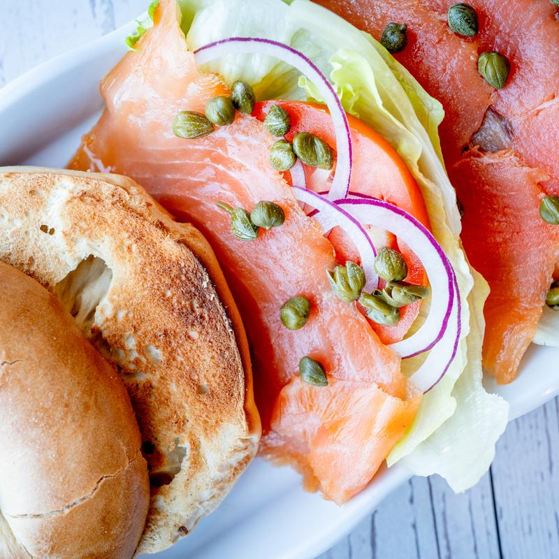 Chilled smoked salmon served on a bed of leaf lettuce with your choice of bagel sliced red onion, tomato, cream cheese and capers.